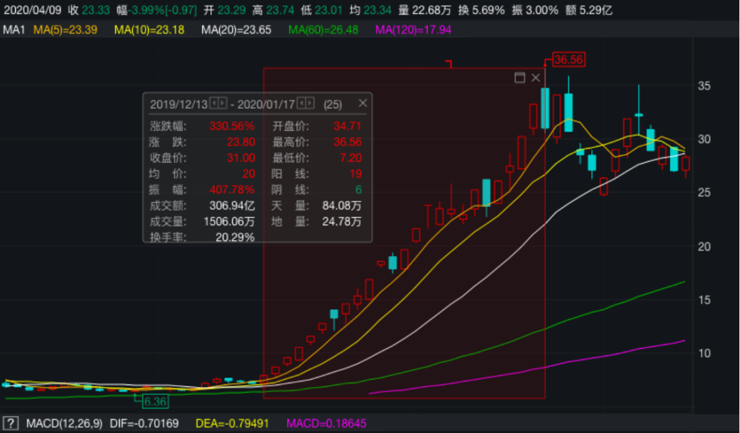 受益于网红经济的影响,自2019年12月傍上网红概念后,星期六股价逆势抬升,在25个交易日内大涨330%,股价从7.2元/飙升至36.56元/股。