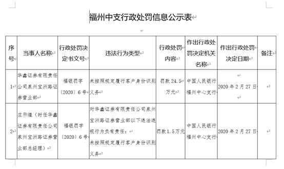 中国人民银行福州中心支行于2020年3月公布的福州中支行政处罚信息公示表(福银罚字〔2020〕6号)显示,华鑫证券有限责任公司泉州宝洲路证券营业部因未按照规定履行客户身份识别义务,被处罚款24.5万元。