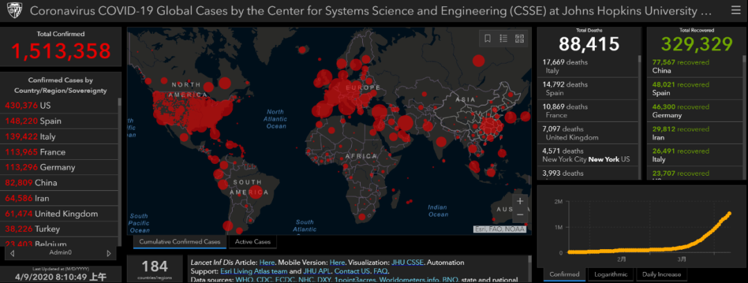 据美国约翰斯·霍普金斯大学实时疫情数据显示,截至北京时间4月9日上午8时,全球新冠肺炎累计确诊病例逾151万,达1513358例;累计死亡逾8.8万例;累计治愈近33万例。美国新冠肺炎累计确诊病例逾43万;累计死亡达1.48万例。目前,美国是全球累计确诊病例数最多的国家,死亡病例数反超西班牙,位居第二。