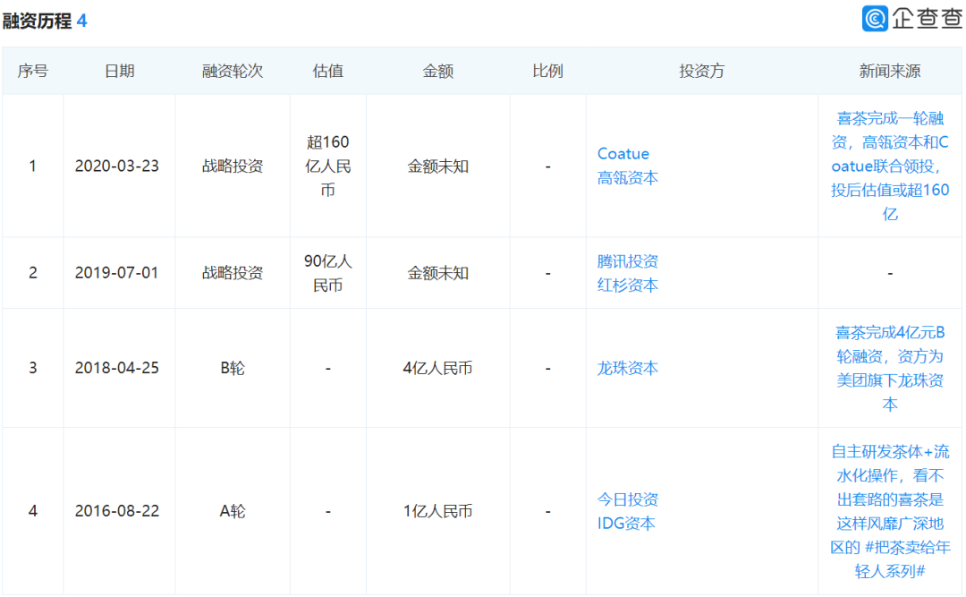 就在2020年3月23日,喜茶逆势完成了最新一轮战略融资,由高瓴资本、Coatue(蔻图资本)联合领投,投后估值已超过160亿元。