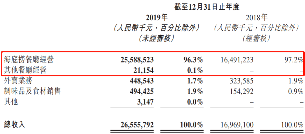 据财报数据显示,海底捞的营收绝大部分来自于线下门店,占比超过96% 。据最新财报数据显示,2019年,海底捞餐厅经营贡献了255.88亿元的营收,每日营收金额超7000万元,在总营收中占比高达96.3%。
