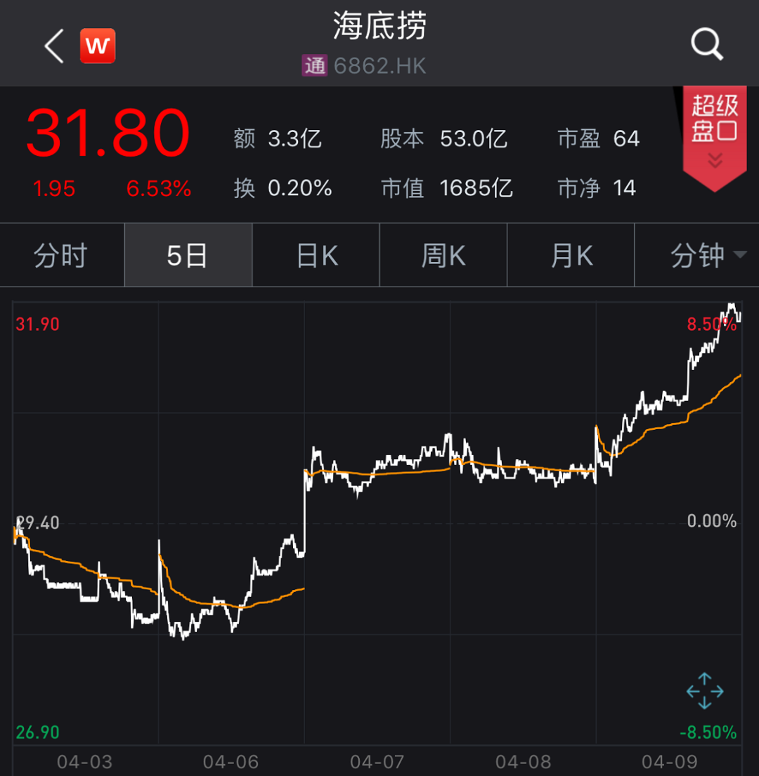 受益于涨价预期,在港股上市的海底捞(06862.HK)股价表现强劲,今日(4月9日)股价暴涨超6.5%,且近4个交易日累计涨幅已超11%,总市值飙升超172亿港元。