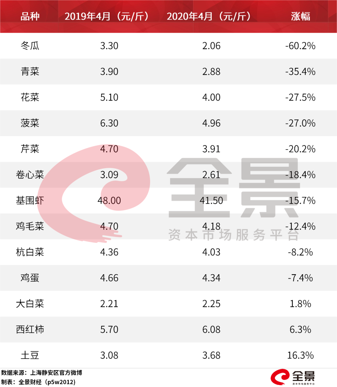 而事实上,2020年大部分蔬菜价格较2019年同期都要便宜。以上海为例,据上海静安区的官方微博披露,鸡蛋、青菜、基围虾等新鲜食材价格均下滑明显。