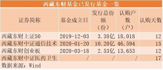 wind数据显示,去年12月以来,西藏东财基金陆续成立了西藏东财上证50、西藏东财中证通信技术等3只指数基金,上述几只基金的发行有以下几个特点: