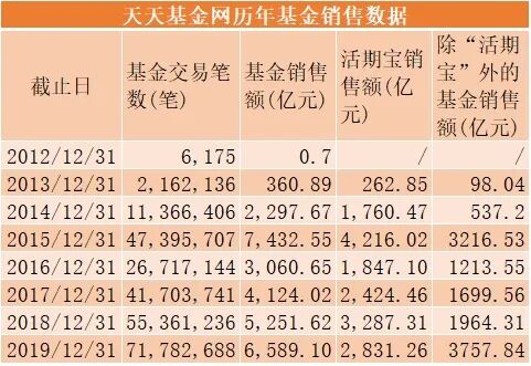 2015年牛市时期,天天基金网曾创下7432.55亿元的基金销售记录,2019年基金全年销售金额仅次于2015年。