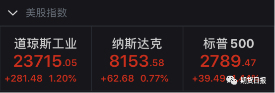 周四美股连续第二日收高。截至收盘,道指涨285.80点,涨幅1.22%,报23719.37点,纳指涨0.77%,报8153.58点,标普500指数涨1.45%,报2789.82点。