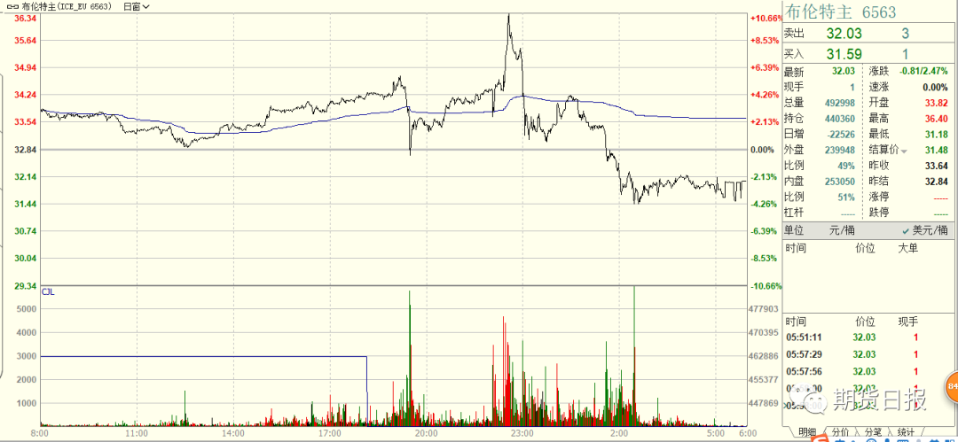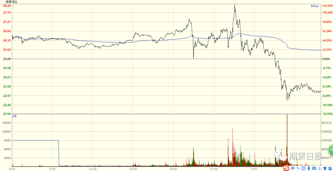 国际油价冲高回落,尾盘跳水,OPEC+减产会议谈判进程令投资者有所失望。截至收盘,WTI原油主力合约跌9.29%,报22.76美元/桶,盘中一度上涨约13%,最高触及28.36美元/桶;布伦特原油主力合约跌4.14%,报31.48美元/桶,盘中一度上涨超10%,最高触及36.40美元/桶。