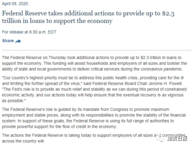 美联储表示,这些计划总计将达到2.3万亿美元,其中包括薪资保护计划和其他旨在向小企业提供资金的措施,以及通过5000亿美元的贷款计划提振市政财政的措施。