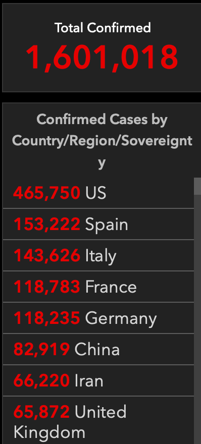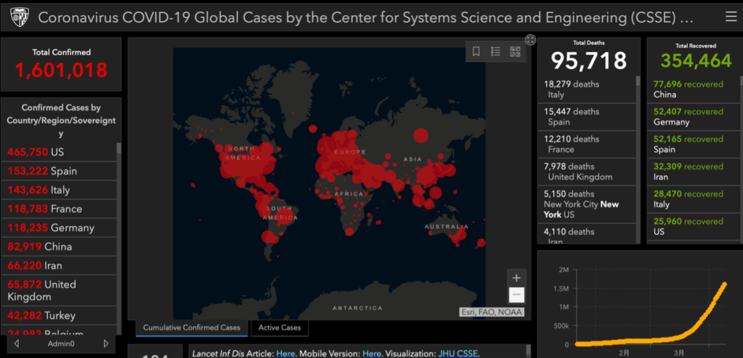 根据约翰霍普金斯大学的全球实时疫情数据显示,截至4月10日11时,全球累计确诊人数已经突破160例,死亡人数近10万例。