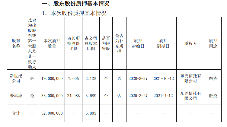 其中,新世纪公司已经质押1.99亿股,占其所持股份的79.6%;锦龙股份董事长朱凤廉已质押1.27亿股,占其所持股份的95.90%;杨志茂已质押6300万股,占其所持股份的86.68%。