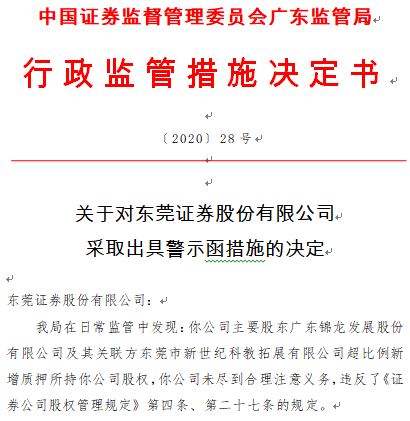 4月8日,广东证监局发布行政监管决定书,称东莞证券的主要股东锦龙股份及其关联方东莞新世纪公司超比例新增质押所持股权,违反了《证券公司股权管理规定》中的相关规定,而东莞证券未尽到合理注意义务。