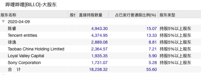 目前,据哔哩哔哩最新披露的大股东信息显示,B站主席和首席执行官陈睿仍为第一大股东,持股比例为15.07%。腾讯为第二大股东,持股比例为13.33%,另外,淘宝排名第四,所持股本比例为7.21%;主题私募股权公司正心谷创新资本(Loyal Valley Capital)为第五大股东;而新加盟的索尼持股5.28%,暂为第六大股东。