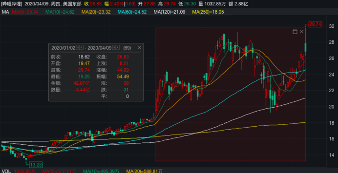 对于张磊执掌的高瓴资本而言,中概股一直保持着核心地位,同时B站也是高瓴持续看好的公司之一。2019年第四季度,高瓴资本继续增持B站。高瓴资本初始建仓时,哔哩哔哩股价只有16美元/股。截至2020年4月10日,哔哩哔哩股价已上涨至26.83美元/股,涨幅接近70%。