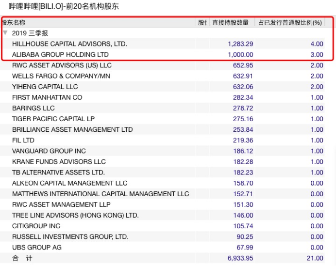 据哔哩哔哩披露,截至2019年三季度,高瓴资本位于其前20名机构股东的首位,直接持股数量为1283.29万股,占已发行普通股比例的4%。