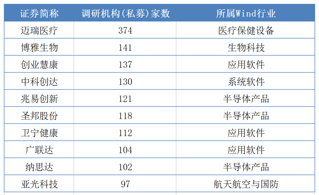 截至4月8日,获得私募调研家数最高的十大上市公司分别是迈瑞医疗、博雅生物、创业慧康、中科创达、兆易创新、圣邦股份、卫宁健康、广联达、纳思达、亚光科技。迈瑞医疗不仅获得374次私募调研,该公司还是敦和资产、同犇投资、煜德投资、世诚投资、弘尚资产等多家私募在调研中关注度最高的个股。