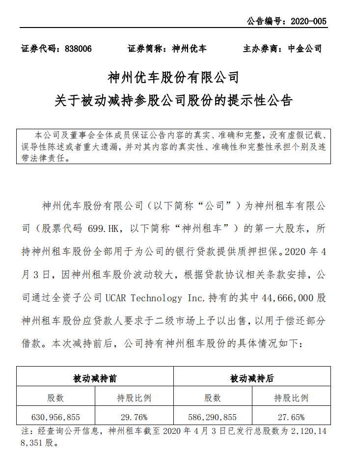神州优车在4月9日公告称,其所持神州租车股份全部用于为公司的银行贷款提供质押担保,因神州租车股价波动较大,根据贷款协议相关条款安排,应贷款人要求,公司通过全资子公司 UCAR Technology Inc.将持有的4467万股神州租车股份(占总股本约2.11%)于二级市场上予以出售,以用于偿还部分借款。本次减持后,神州优车持有神州租车股份约27.65%。