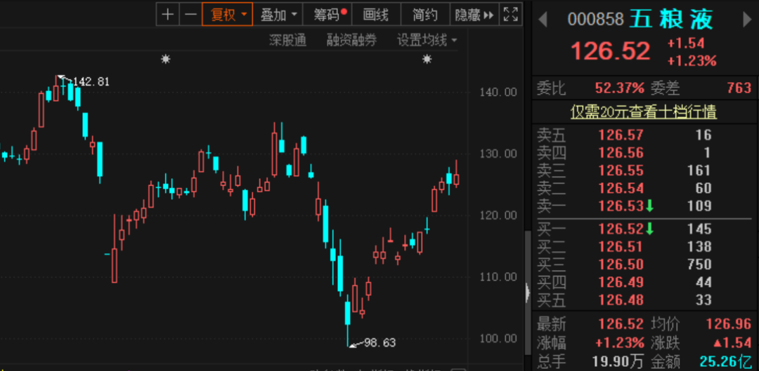 北上资金本周大幅加仓白马股,持仓市值超百亿元的重仓股大部分获得净买入。其中五粮液获得13.74亿元净买入,为本周唯一净买入超10亿元的个股,2个交易日加仓均超百万股,周二净买入731万股,周三净买入379万股。在这2个交易日中,北上资金的买卖成交额占五粮液总成交额的近一半。五粮液本周大涨7.66%,股价的上涨叠加股份的增加,北上资金持有五粮液市值重新回到400亿元以上。