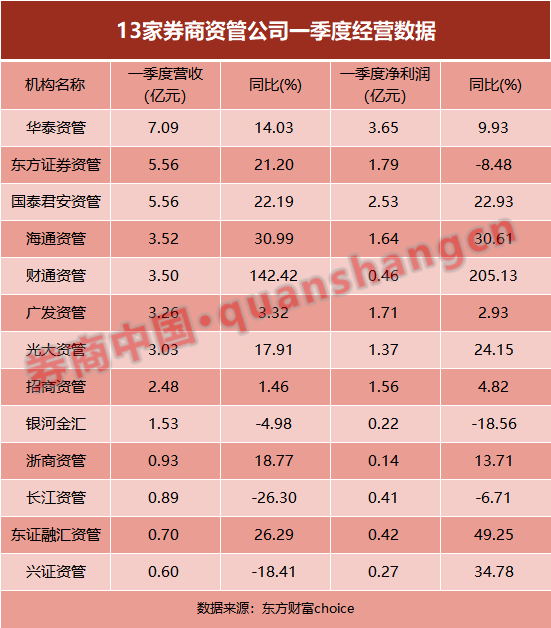 一季度来看,10家券商资管子公司营收同比增长,财通资管3.5亿元的营收同比增幅142%,位居第一;10 家净利润同比增长,依然是财通资管增幅最大。长江证券(上海)、银河金汇、东方资管净利润同比略有下滑。