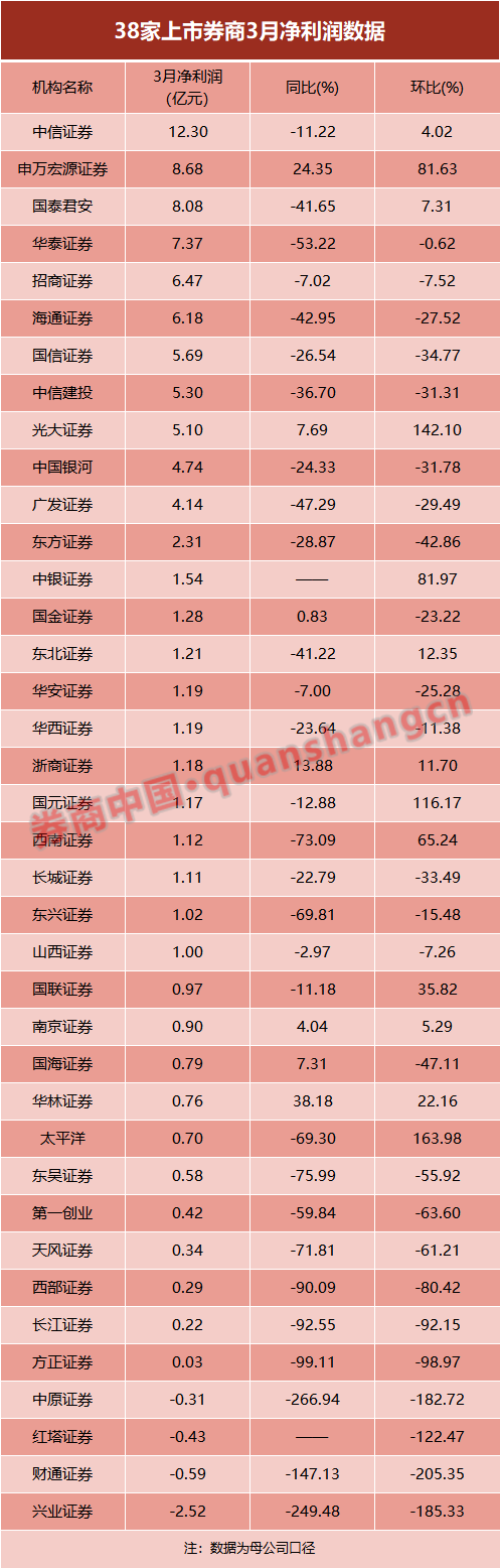 截至4月10日晚间,38家上市券商(含国联证券)均发布了3月月报。受疫情蔓延下全球股市“狂跌”影响,A股也呈现震荡下跌态势,逾七成券商单月净利润出现环比下滑。中信证券以28.05亿元的营收、12.30亿元的净利润稳居第一。