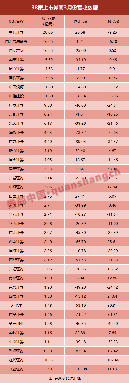 包含上述两家单月营收为负的券商在内,共有26家上市券商3月份营收环比下滑,海通证券单月营收4.63亿元,同比、环比下滑均超过七成,分析人士认为或是投资业务业绩表现较差所致。