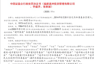 具体来看,福建道冲控制使用“张某”“李某堃”“陈某锋”“李某”“张某燕”等多家证券公司9个个人证券账户和“福建道冲”“上海道策信息技术有限公司”等多家证券公司3个公司证券账户。