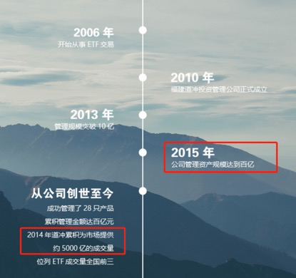 福建道冲官网介绍称,2014年道冲累积为市场提供约5000亿的成交量 ,位列ETF成交量全国前三。2015年,公司管理资产规模达到百亿。