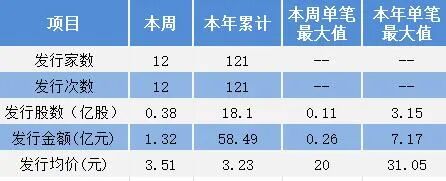 本周共有12家公司实施增发,合计募集资金1.32亿元,其中单笔最大值为2600万元。本年累计发行融资58.49亿元。