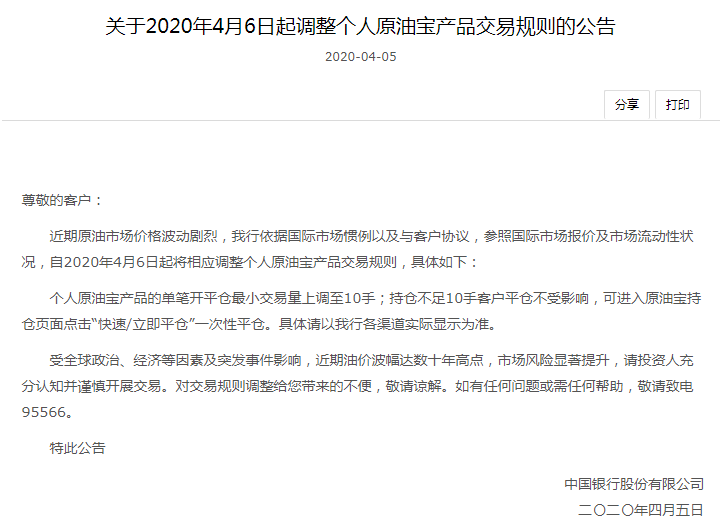 在此基础上,中行又从本周开始调整账户原油交易规则,将单笔开平仓最小交易量由1手上调至10手(即10桶),持仓不足10手客户平仓不受影响。