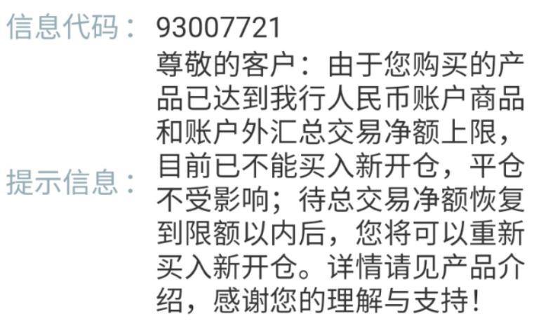 记者在下单确认时,工行APP客服提示称,“由于您购买产品已达到我行人民币账户商品和账户外汇总交易净额上限,目前已不能买入新开仓(做多),平仓不受影响;待总交易净额恢复到限额以内后,您将可以重新买入新开仓。”