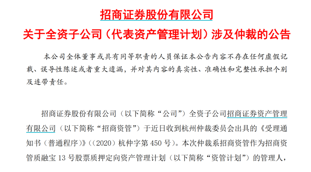 近日,招商证券全资子公司招商资管收到杭州仲裁委员会出具的《受理通知书》,事涉招商资管质融宝13号股票质押定向资产管理计划(简称“质融宝13号”)。