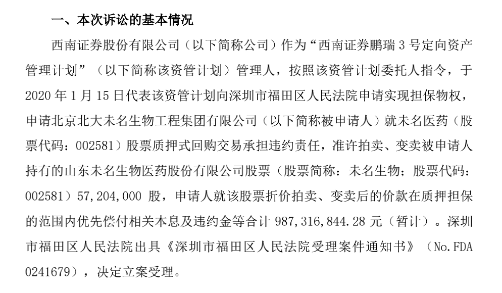 而到了2月29日,西南证券又披露,公司作为“西南证券鹏瑞3号定向资产管理计划”管理人,按照该资管计划委托人指令,于1月15日代表该资管计划申请实现担保物权,申请北京北大未名生物工程集团有限公司就5720.4万股”未名医药”股票质押式回购交易承担违约责任,优先偿付相关本息及违约金等合计9.87亿元(暂计)。目前深圳市福田区人民法院已决定立案受理。
