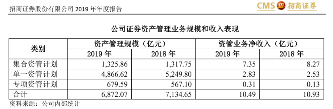 以招商证券为例,年报数据显示,2019年在三大类资管计划中,仅单一资管计划(定向资管计划)规模出现了下降,由2018年年底的5249.80亿元下降7%至4866.62亿元;专项资管计划(资产证券化)则同比增加20%至679.59亿元;集合资管计划也同比微增,保持在了1325.86亿元。