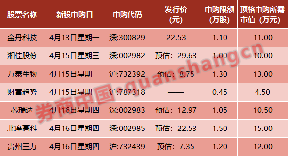 本周共有7只新股申购,分别是金丹科技、湘佳股份、万泰生物、财富趋势、芯瑞达、北摩高科以及贵州三力。