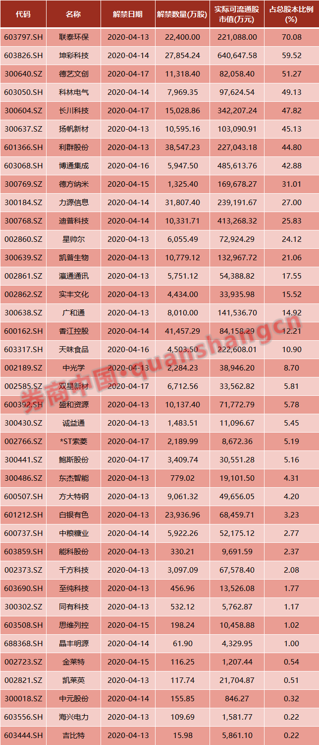 数据显示,本周(4月13日-4月17日)共有39家公司限售股陆续解禁,合计解禁量33.52亿股,按4月10日收盘价计算,解禁市值为429.06亿元。