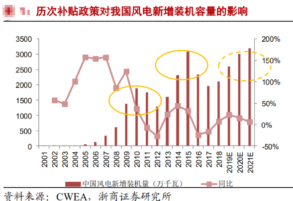 2009 年我国首次实施风电上网标杆电价政策,2009-2010 年风电新增装机容量大幅增长,2010 年首次达到历史新高 18.93GW;2015 年风电上网标杆电价首次下调,再次引起抢装潮,2014-2015 年风电新增装机容量大幅增长,2015 年装机容量再创新高达到 30.75GW。浙商证券认为2019 年本次风电补贴政策的下调,仍会引领新一轮风电抢装潮。