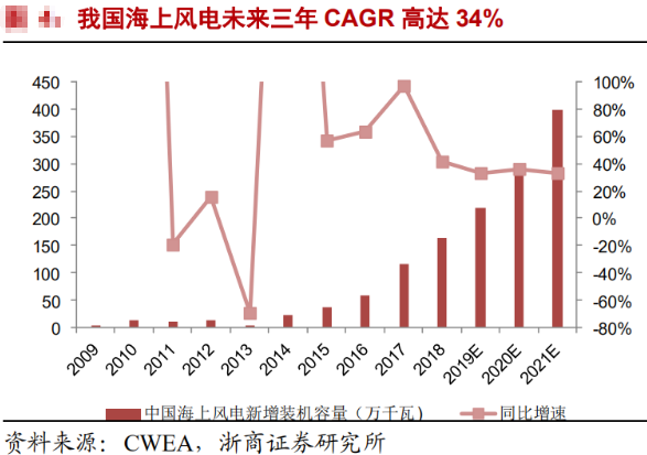 2016年 11 月国家能源局在印发的《风电发展“十三五”规划》中提出积极稳妥推进海上风电建设,到 2020 年全国海上风电开工建设规模达到 1000 万千瓦,力争累计并网容量达到 500 万千瓦以上。截至 2018 年底我国海上风电累计装机规模为 444.5 万千瓦,已核准的海上风电项目达 2300 万千瓦。浙商证券预计 2019~2020 年我国海上风电新增装机容量分别为2.2GW、3GW、4GW。