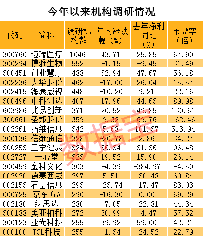 今年已经有70多只个股获得了百家以上机构调研。博雅生物、创业慧康、大华股份、海康威视、中科创达等个股均有400多家机构调研,兆易创新、圣邦股份、拓维信息等20多只个股均有200多家机构调研。