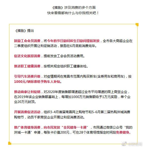 疫情期间,只要在南昌市范围内购买新车(含乘用车和商用车),就将按1000元/辆标准给予购车人补贴,虽然数额不大,但基金君在微博上看到一些消费者已经拿到了补贴,说明政策已落到实处。