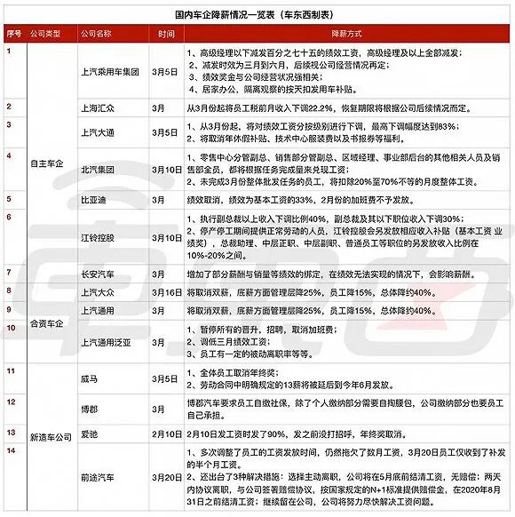 在薪资调整方面做的最坚决的当属上汽集团,旗下多个子公司如上汽大通、上汽汇亚、上汽通用泛亚、上汽乘用车集团,甚至上汽大众、上汽通用都做出了降薪的决定。