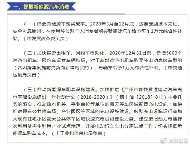 广州明确,2020年3月至12月底,按照鼓励技术先进、安全可靠原则,在使用环节对个人消费者购买新能源汽车给予每车1万元综合性补贴,对置换或者购买“国六”标准新车的给予3000元补助。
