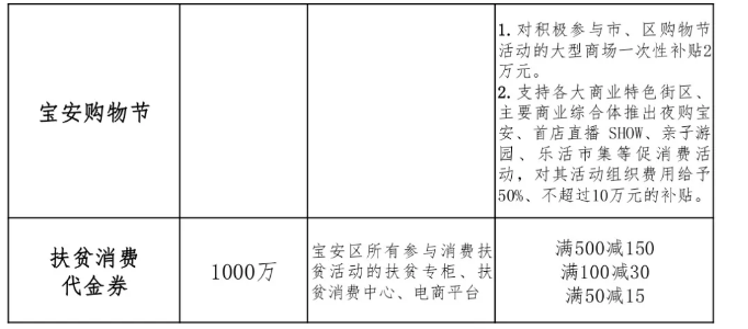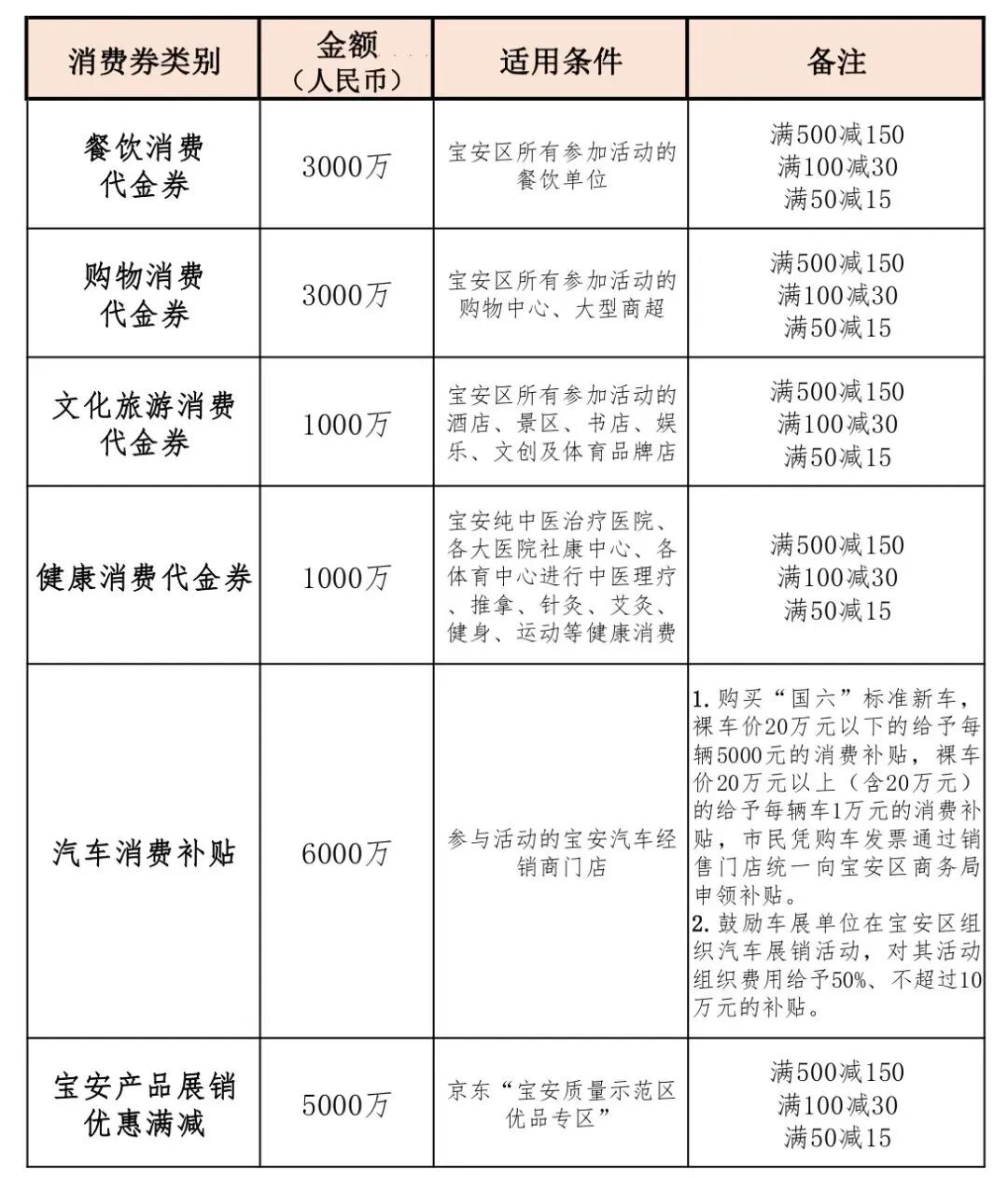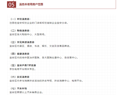 具体来看,消费券涉及的内容涵盖美食、购物、文化旅游、健康消费、购车等多个方面,包含“宝安美食行动、全民热购行动、文化旅游消费行动、健康生活行动、宝车乐购行动、宝安产品展销、宝安购物节、消费扶贫行动”8大项。