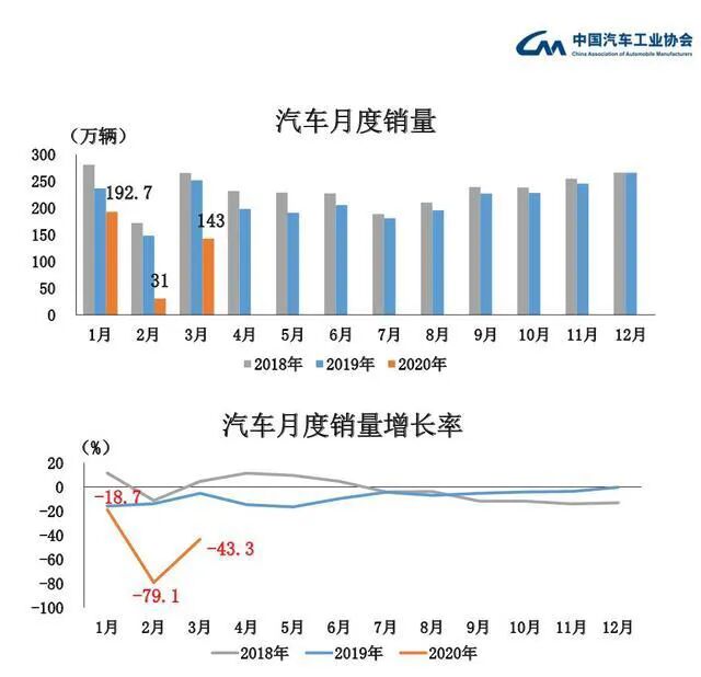 4月10日,中汽协公布3月份销量数据。3月,中国市场汽车产销分别完成142.2万辆和143万辆,环比增长399.2%和 361.4%,同比分别下降44.5%和43.3%,降幅较2月分别收窄35.3和35.8个百分点。