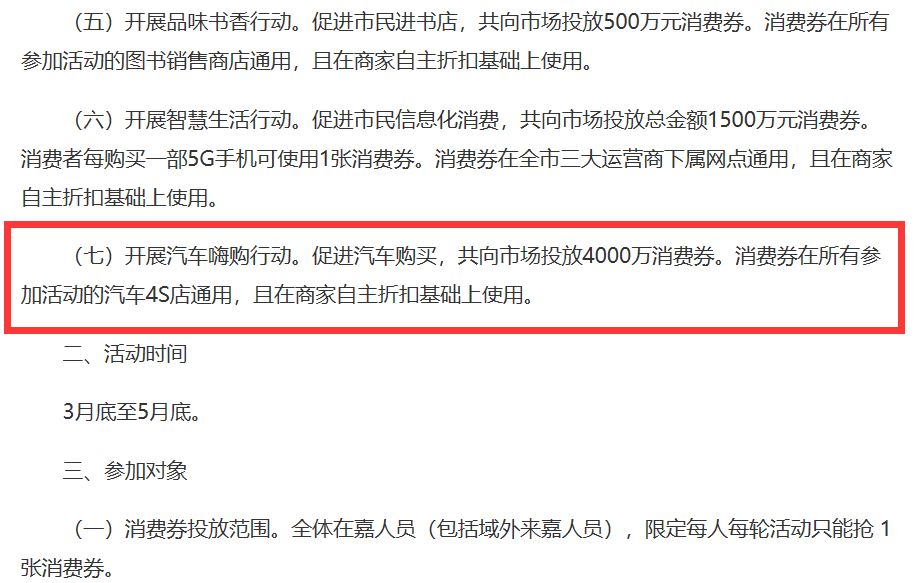 其中,促进汽车购买,共向市场投放4000万消费券。消费券在所有参加活动的汽车4S店通用,且在商家自主折扣基础上使用。据了解,此次活动时间为3月底到5月底。