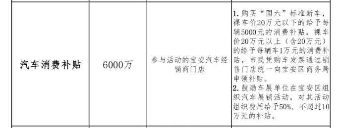 汽车消费是促消费行动的一大重点,宝安区计划安排6000万元,鼓励消费者在宝安区购买汽车,最高补贴1万元,同时对在宝安区组织车展的单位进行补贴。