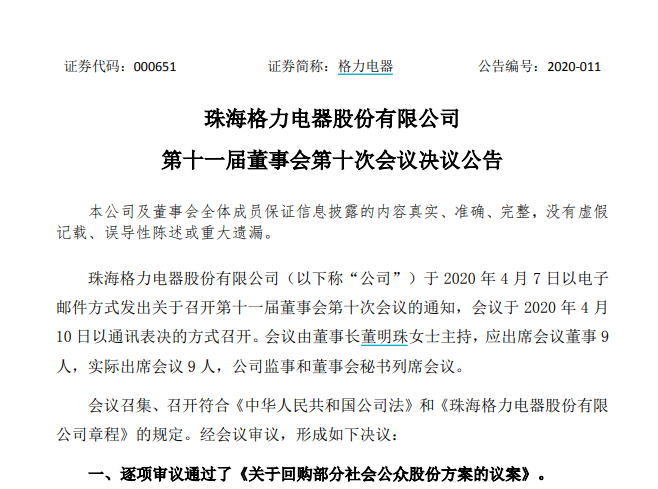 格力电器于4月12日晚公告称,公司已于2020年4月7日以电子邮件方式发出关于召开第十一届董事会第十次会议的通知,会议于2020年4月10日以通讯表决的方式召开。会议由董事长董明珠女士主持。