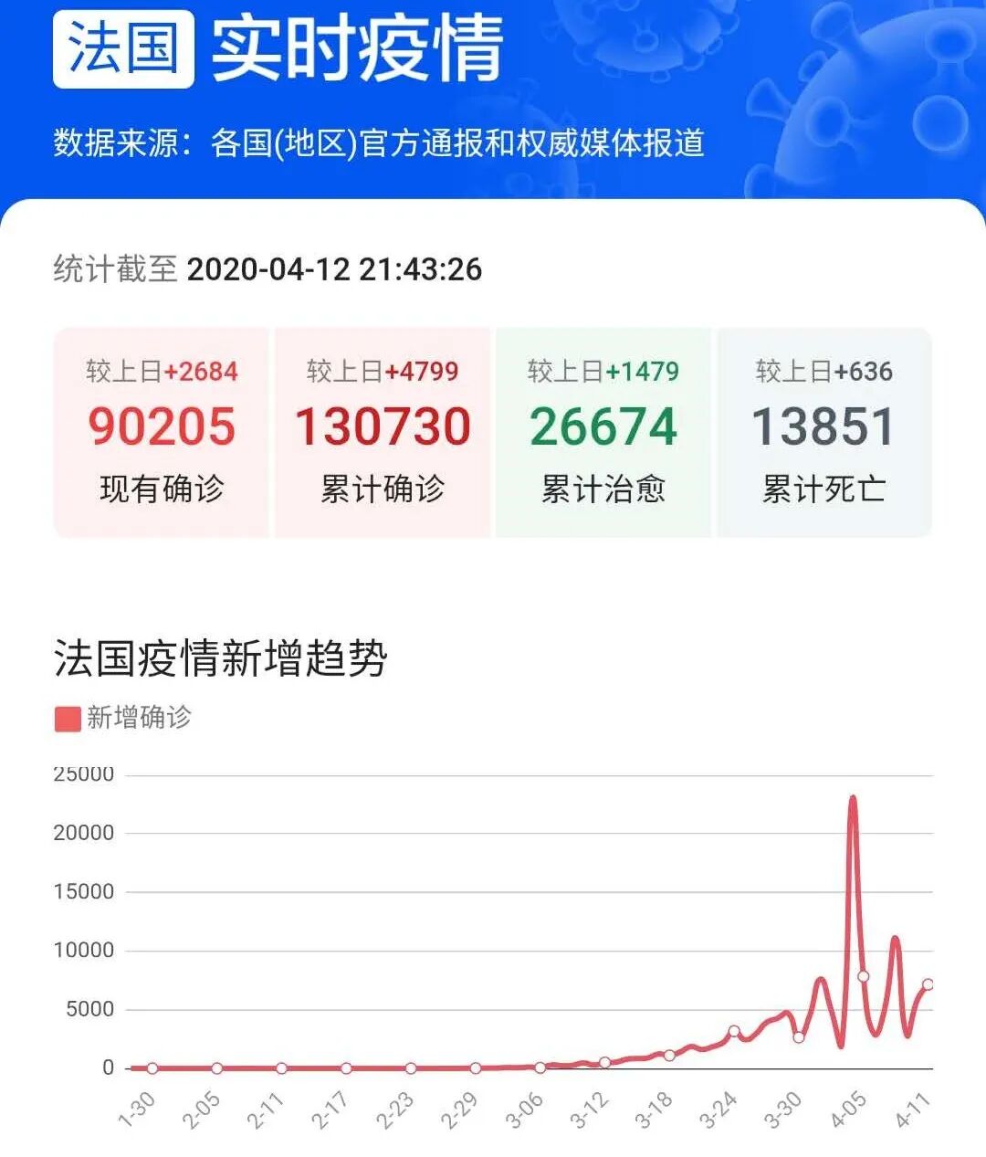 欧洲多个国家单日新增病例呈下降趋势,其中据西班牙卫生部12日最新通报,过去24小时内,西班牙新增4167例新冠肺炎确诊病例,累计确诊166019例,较前一日新增4830例有所下降。