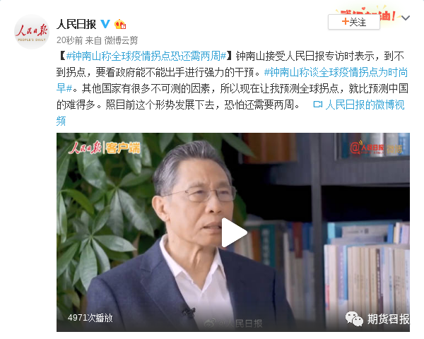 钟南山预计,全球拐点还需要两周。