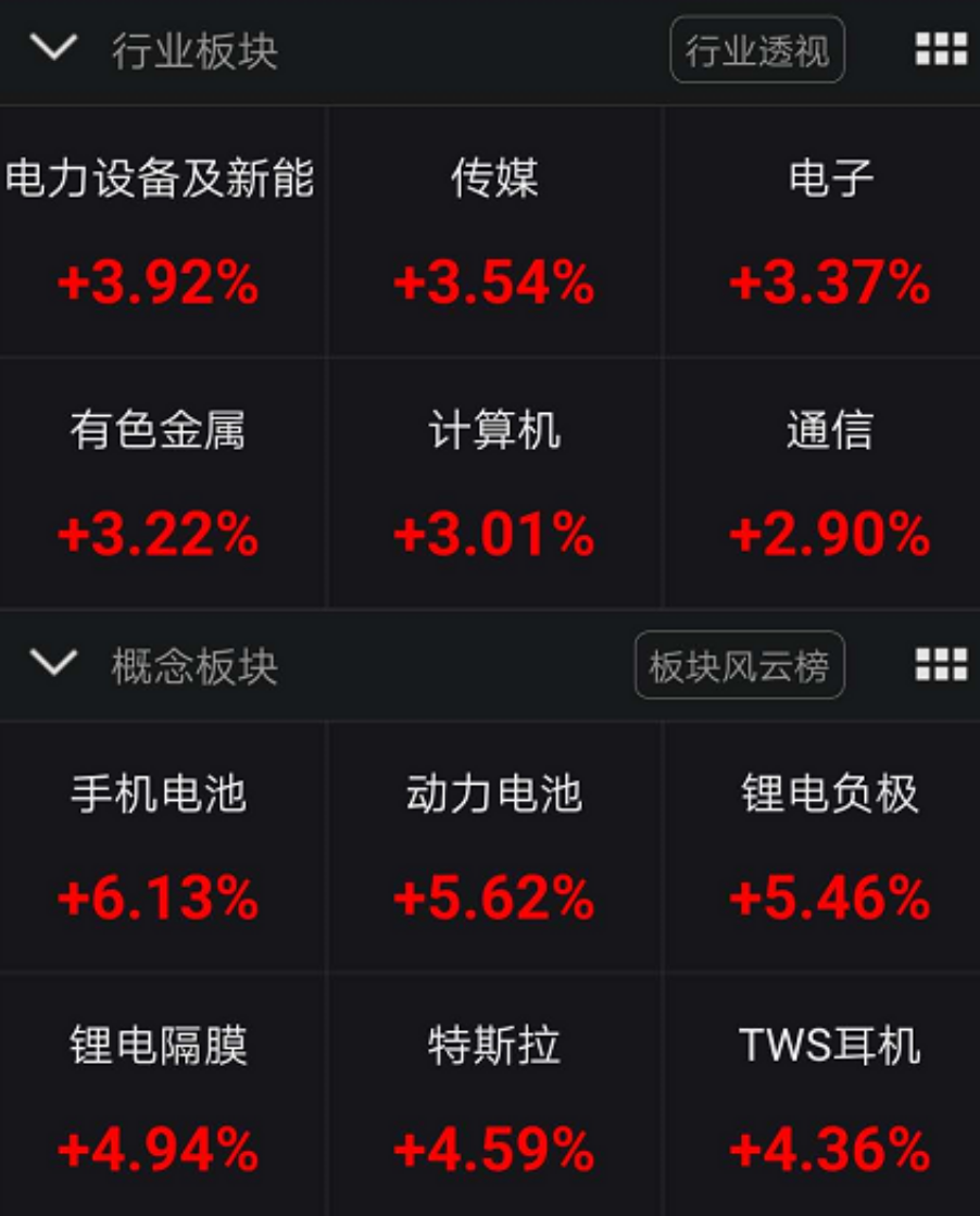 与此同时,当天新能源汽车产业链相关题材先后出现大涨。其中,动力电池指数涨超5%以上,特斯拉、锂电池、锂矿、充电桩等产业链指数涨幅居前。