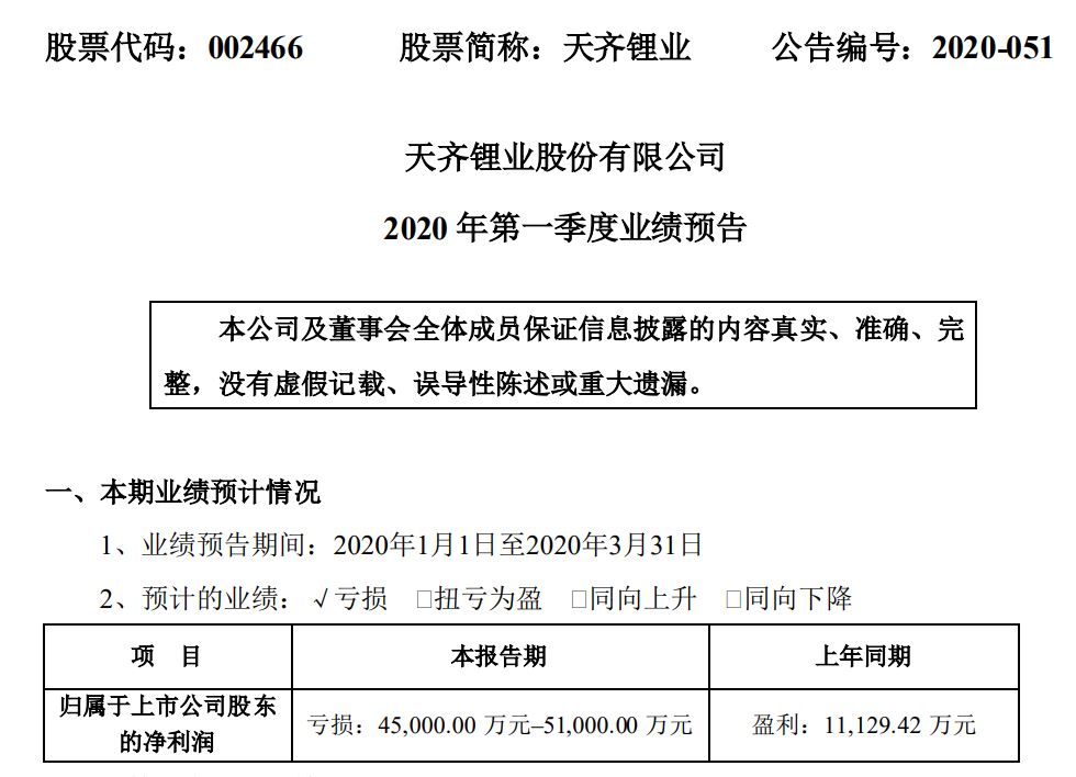 天齐锂业2020年第一季度业绩预告,归属于上市公司股东的净利润亏损4.5亿元–5.1亿元,上年同期盈利1.11亿元。