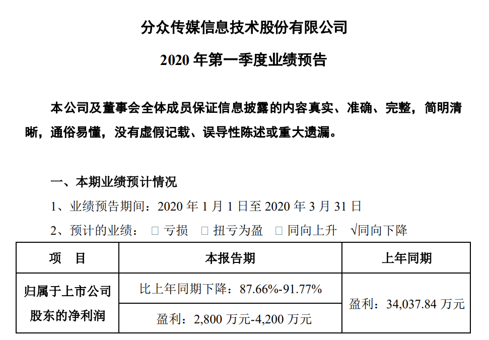 分众传媒发布业绩预告,预计一季度净利为2800万元-4200万元,同比下降87.66%-91.77%。